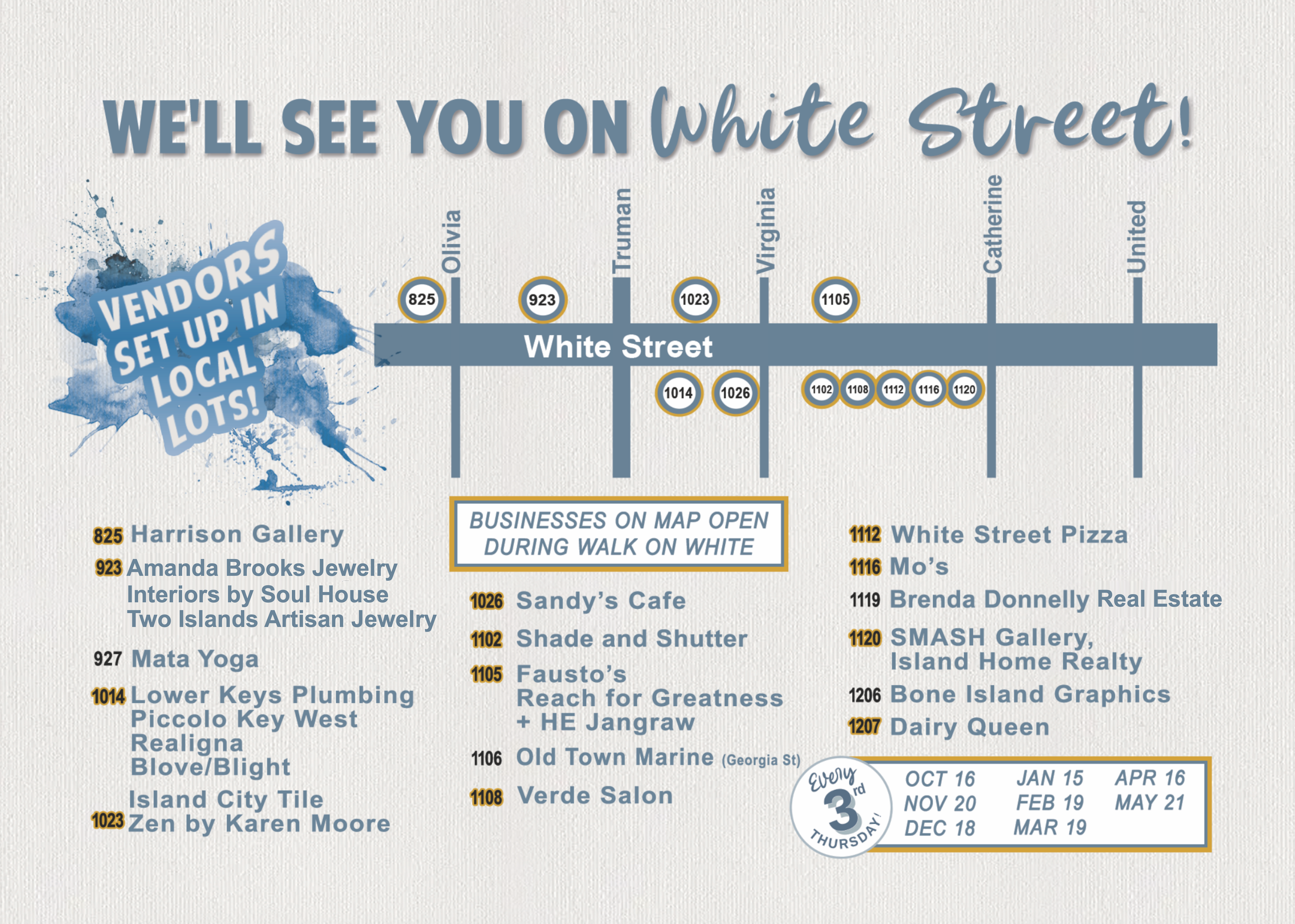 Stretching along White Street from Petronia to United, Walk on White takes place the third Thursday of each month through May, proudly supported in part by the Monroe County Tourist Development Council.